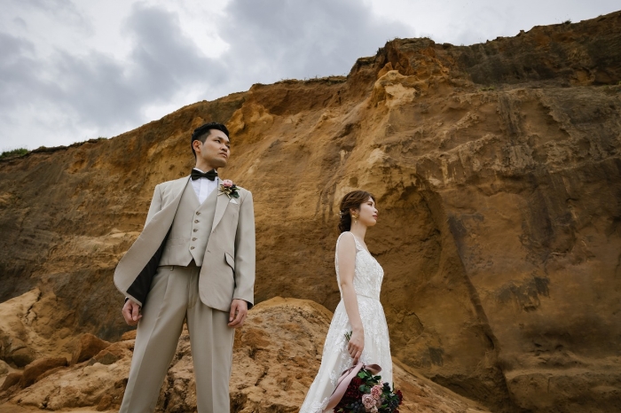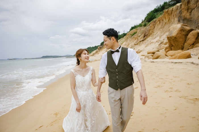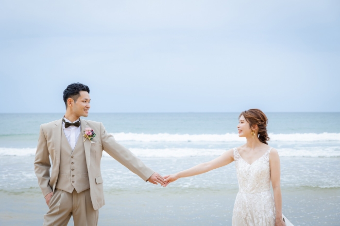 海をバックに爽やかな写真はお二人のより自然体な表情を引き出します。