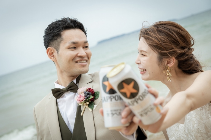 最後はお二人の好きなビールと一緒に♪ロケーション撮影ではお二人の好きなものを持ち込んで一緒に撮影も楽しめます。
